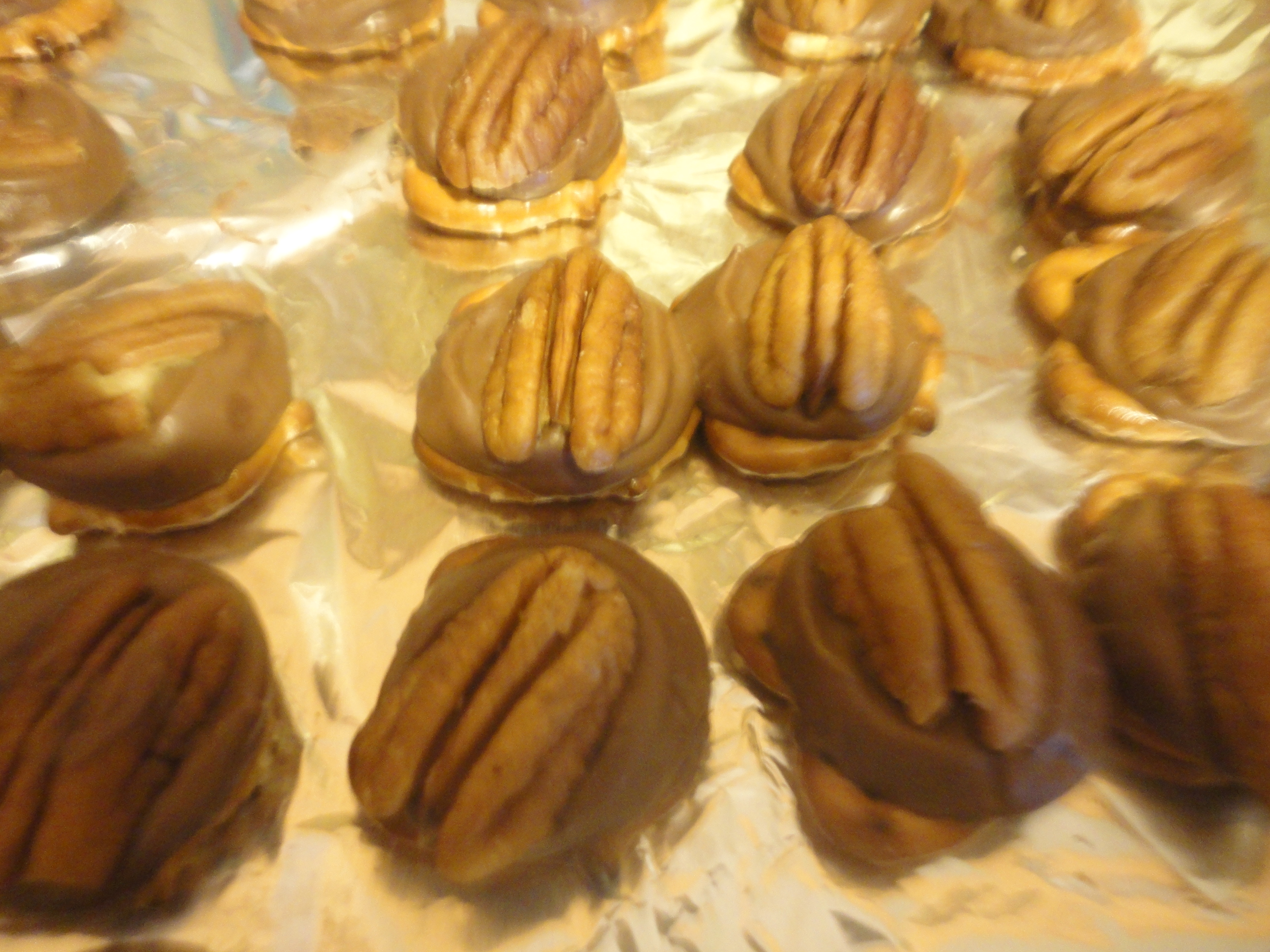 - Carefully pull out the oven and place either an M&M or a pecan half on the melted Rolo.