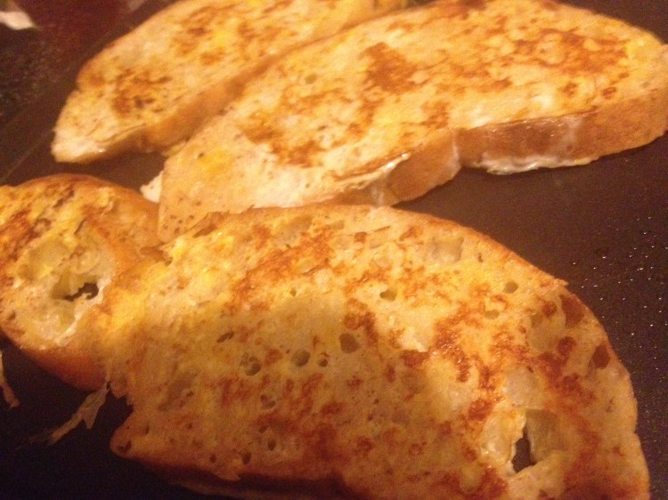 French toast is simple to make, and you can try various loaves of bread. I usually use sandwich bread, or if I want to make sticks, I’ll use Texas toast bread because it’s thicker. When I made it on Saturday, I used ciabatta bread for Hubby, Imaginative One, and myself. I used sandwich bread for the Wee One because he likes me to cut them into strips.