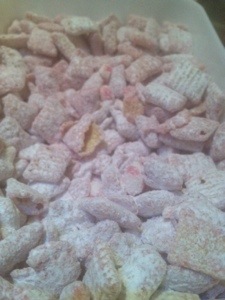 - Put the powdered sugar and crushed candy canes in a gallon-sized bag. Add the cereal to the bag.
