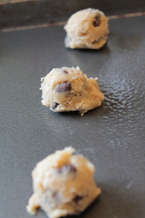 - Drop cookie dough by tablespoons onto a baking sheet.