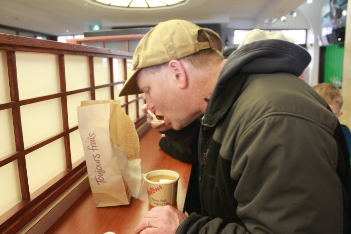 Eating Tims – In Canada, they call Tim Horton’s Tims. By the end of the trip, the boys and I were calling it Tims. Everything was written in English and French as you can see on the bag by Hubby.