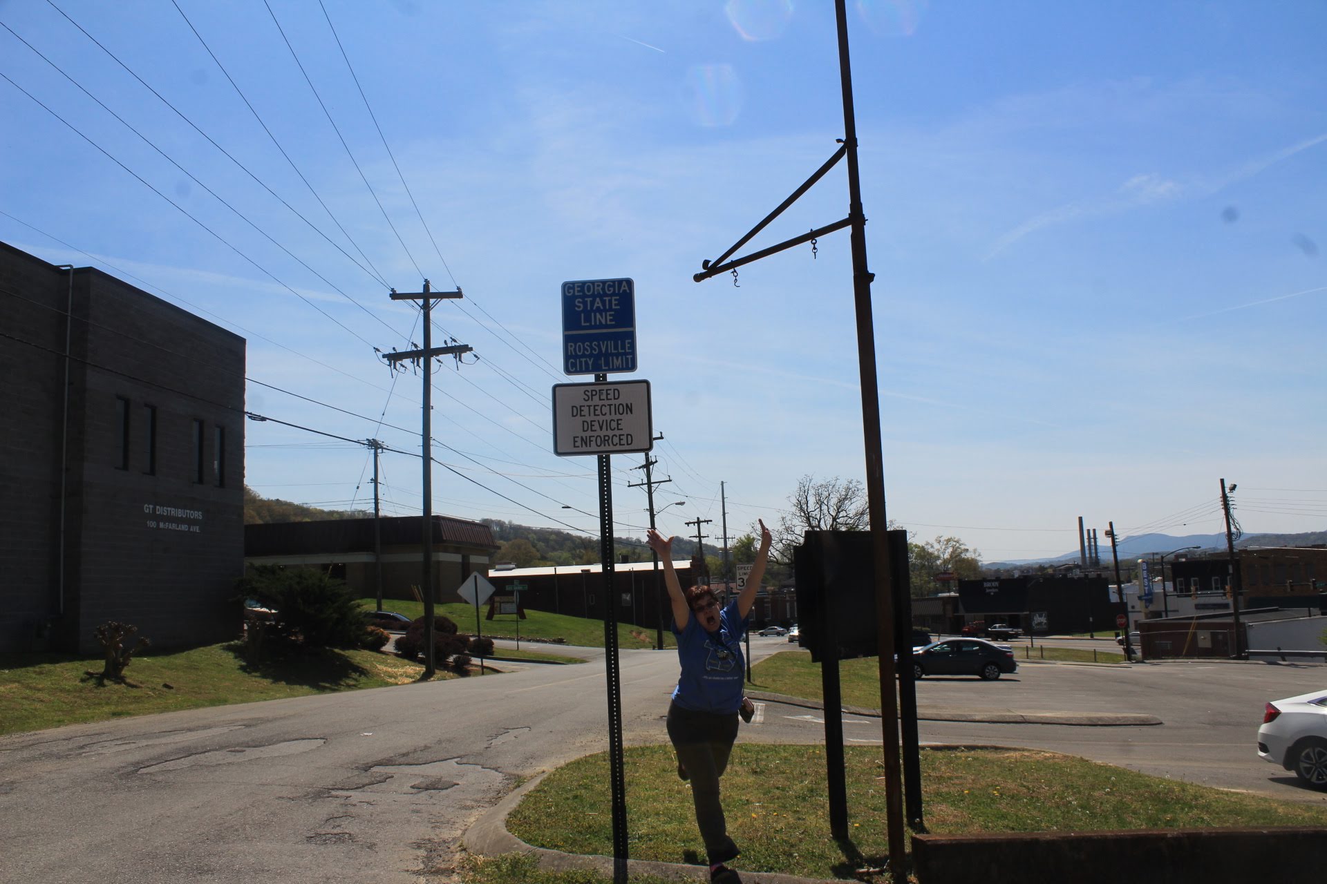 We visited Chattanooga, Tennessee which is within spitting distant of Georgia and Alabama. We never traveled to Alabama because there wasn’t any attractions or major towns/ cities that were within a half an hour of where we were staying. Georgia is a different story. We traveled to Georgia to eat lunch on Wednesday. Instead of hopping back onto the backed up 75, we took a different route. We found the sign for the state line. So we parked the car, got out, and took photos. I hopped into Tennessee and then back into Georgia.