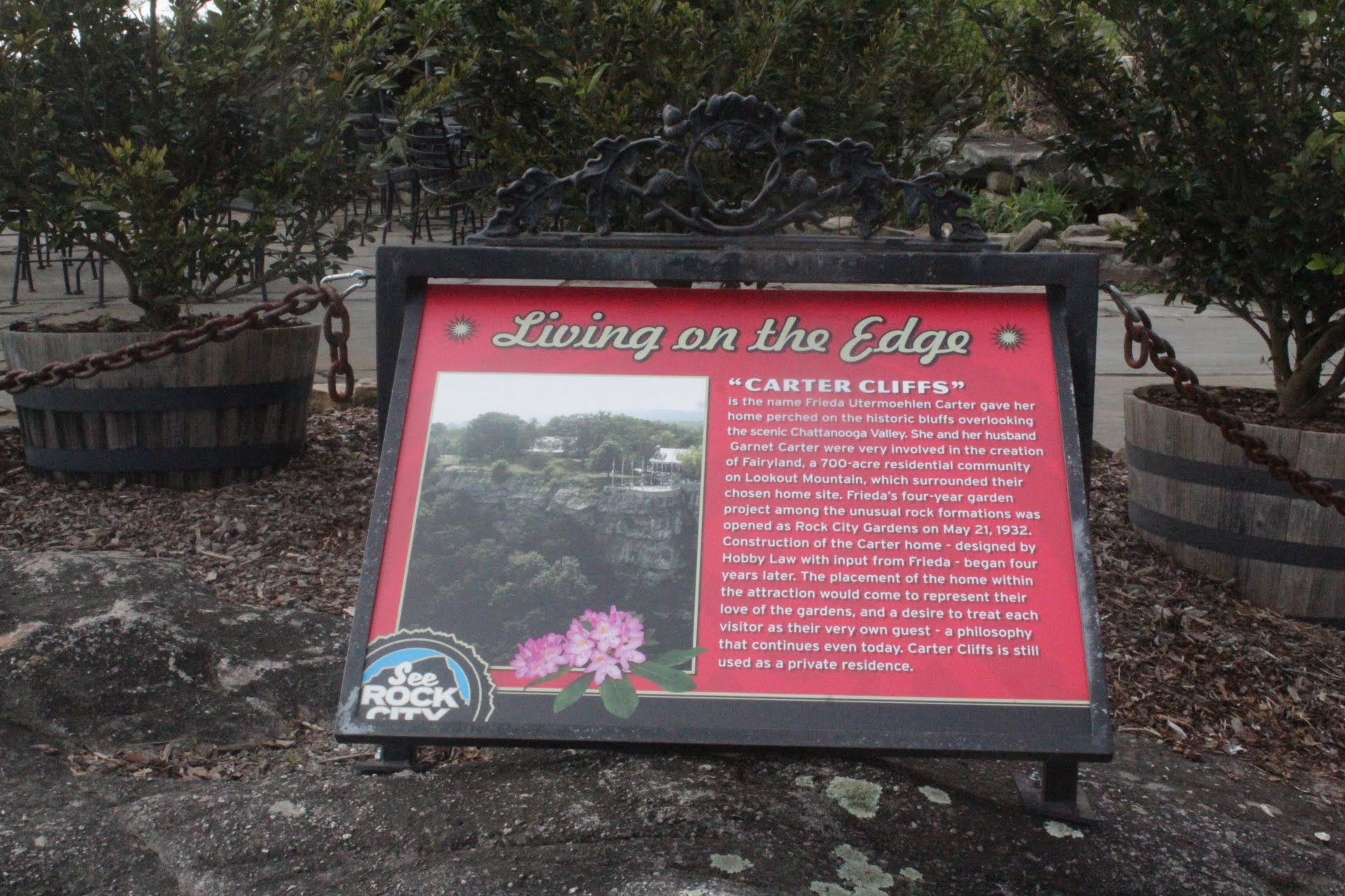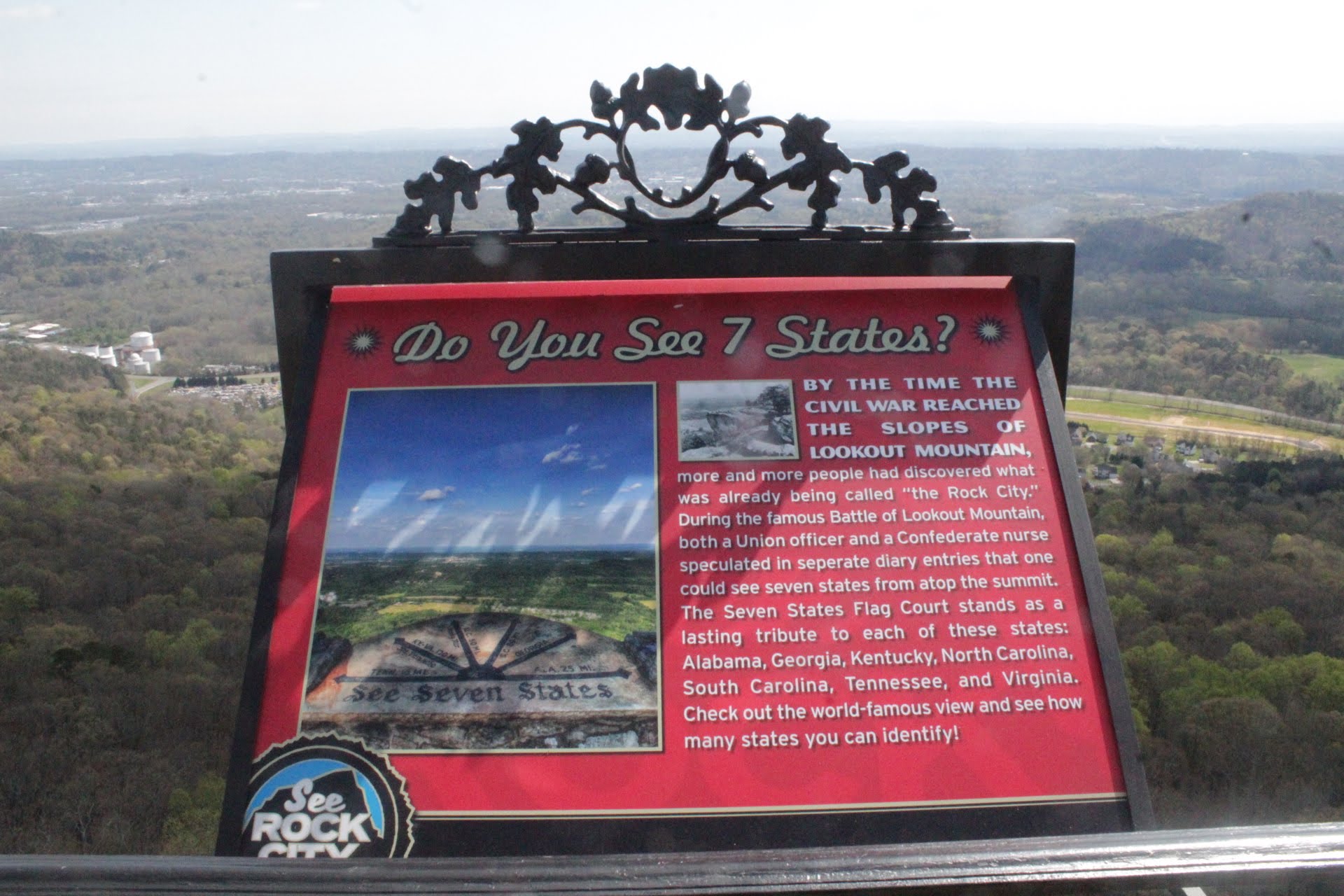 The coolest part of Rock City is the Overlook. You can see 7 different states from that overlook. The states are Georgia, Tennessee, Alabama, Virginia, Kentucky, South Carolina, and North Carolina. So neat!