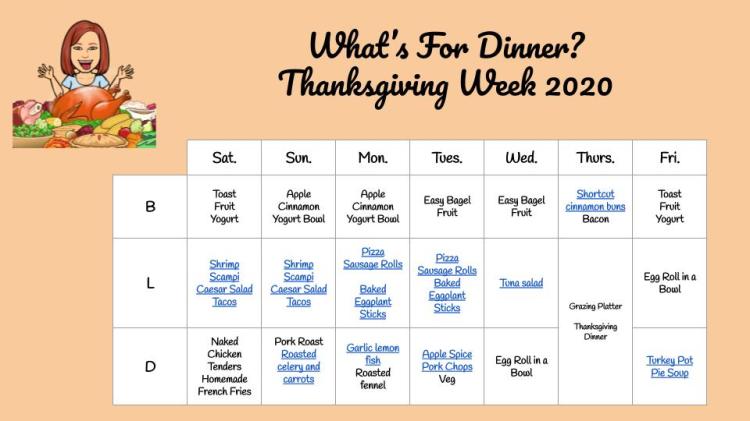 I was going to be home this week anyway because it is Thanksgiving break. However, our plans for Thanksgiving have changed due to the fact my youngest is in quarantine for possible exposure. I’m going to be making our Thanksgiving dinner. I’ll make a big meal that can be eaten at lunch time and then we’ll have a grazing dinner or leftovers later on in the day.