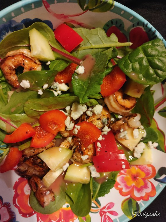 - After the shrimp are finished cooking, place on the greens and veggies.