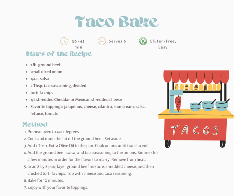 Youngest and I love eating tacos. This recipe is a combination of tacos and nachos in a casserole. YUM!