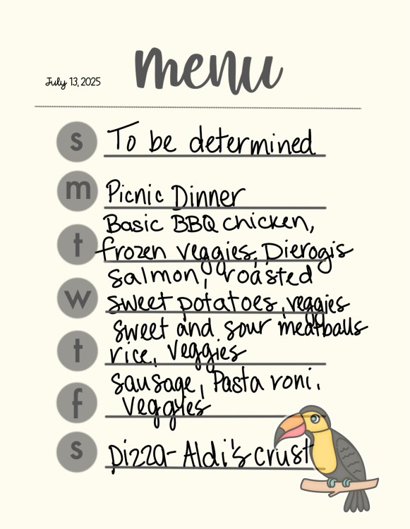 I’ve had the meal plan done since Thursday but never posted it here. There are going to be some tweaks. The picnic dinner will be changed to later in the week or next week. So tonight is up in the air of what I am going to be cooking.